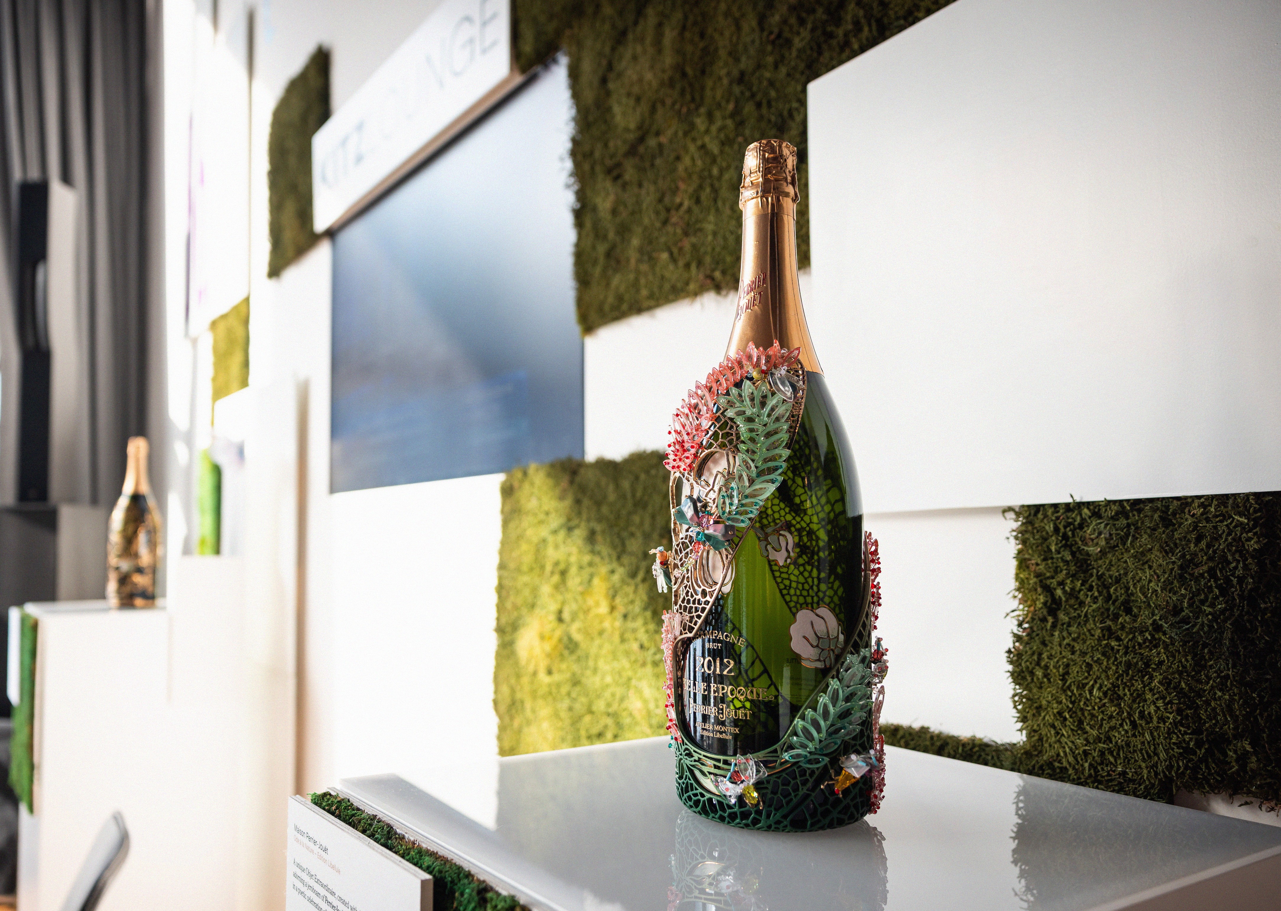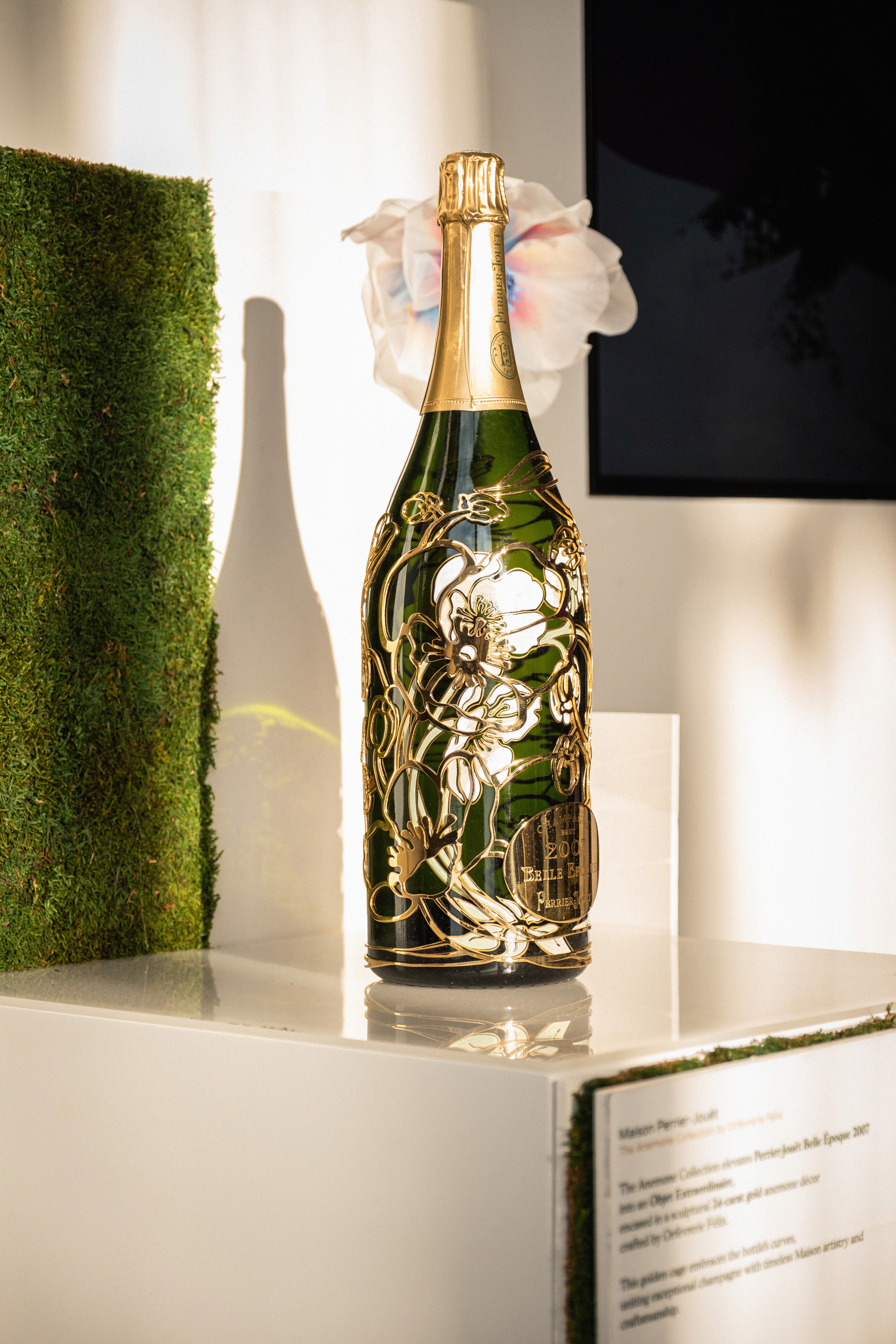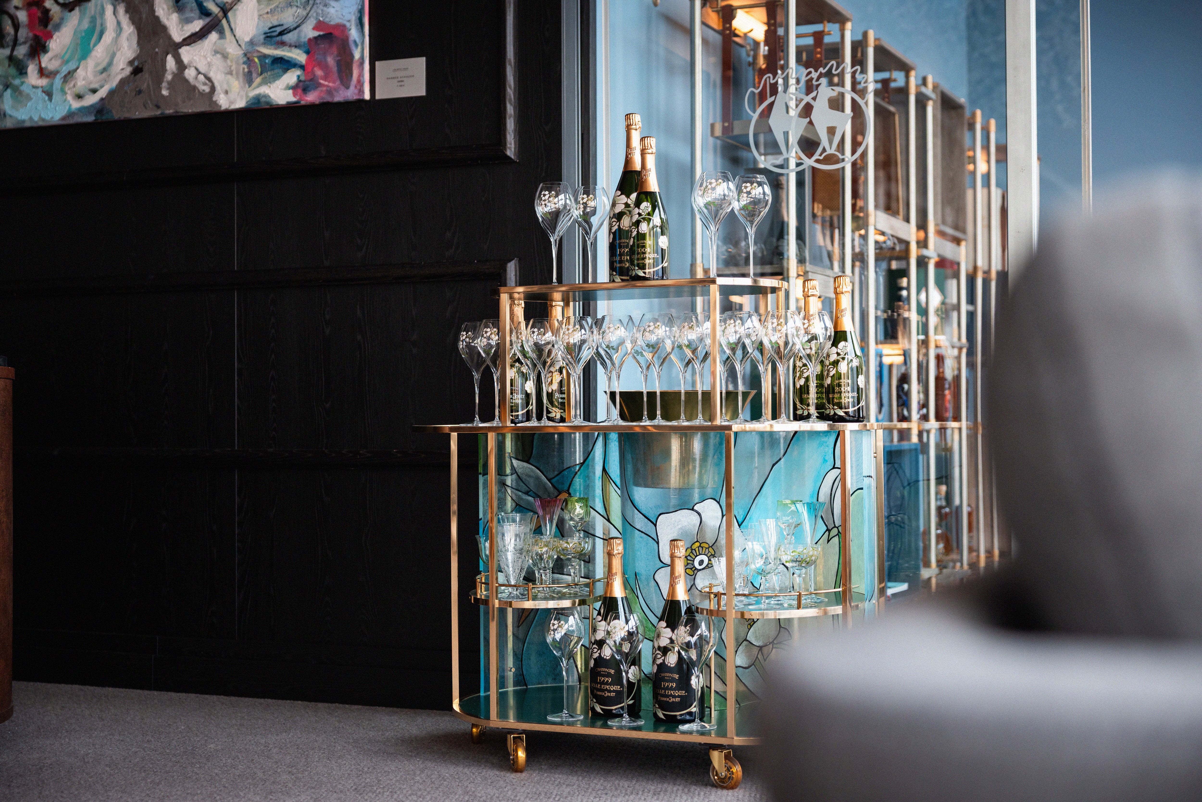 A major highlight of the placement was the Perrier-Jouët “Glass Ritual” trolley. The piece was enhanced with a hand-painted, Art Nouveau-inspired curved glass element that structures the interior while serving as a sculptural feature. Additional shelving levels improve functionality, and an integrated champagne cooler allows for fully operational use. Its mobility enables flexible positioning — whether placed in front of the bar or within the lounge area.