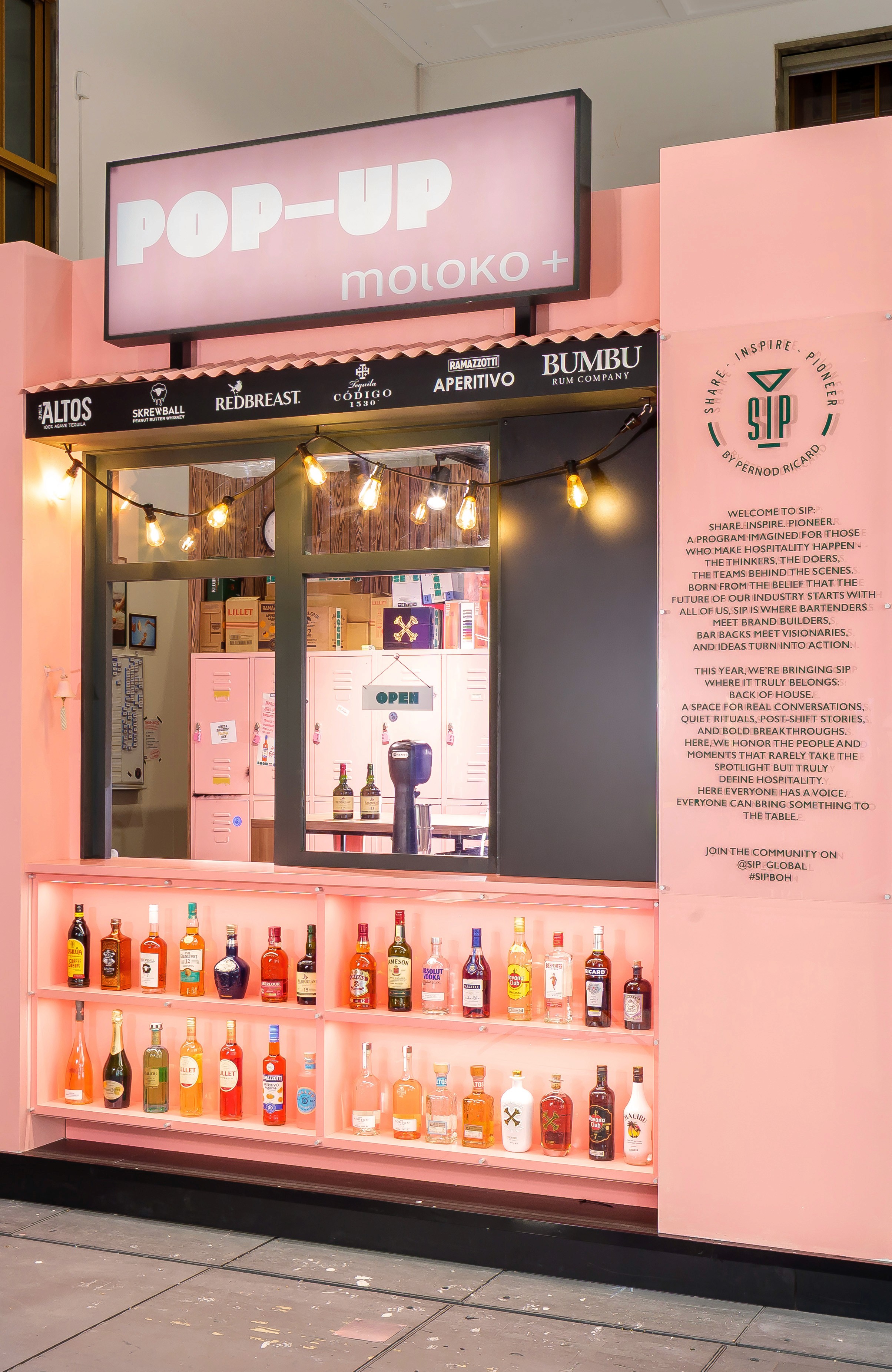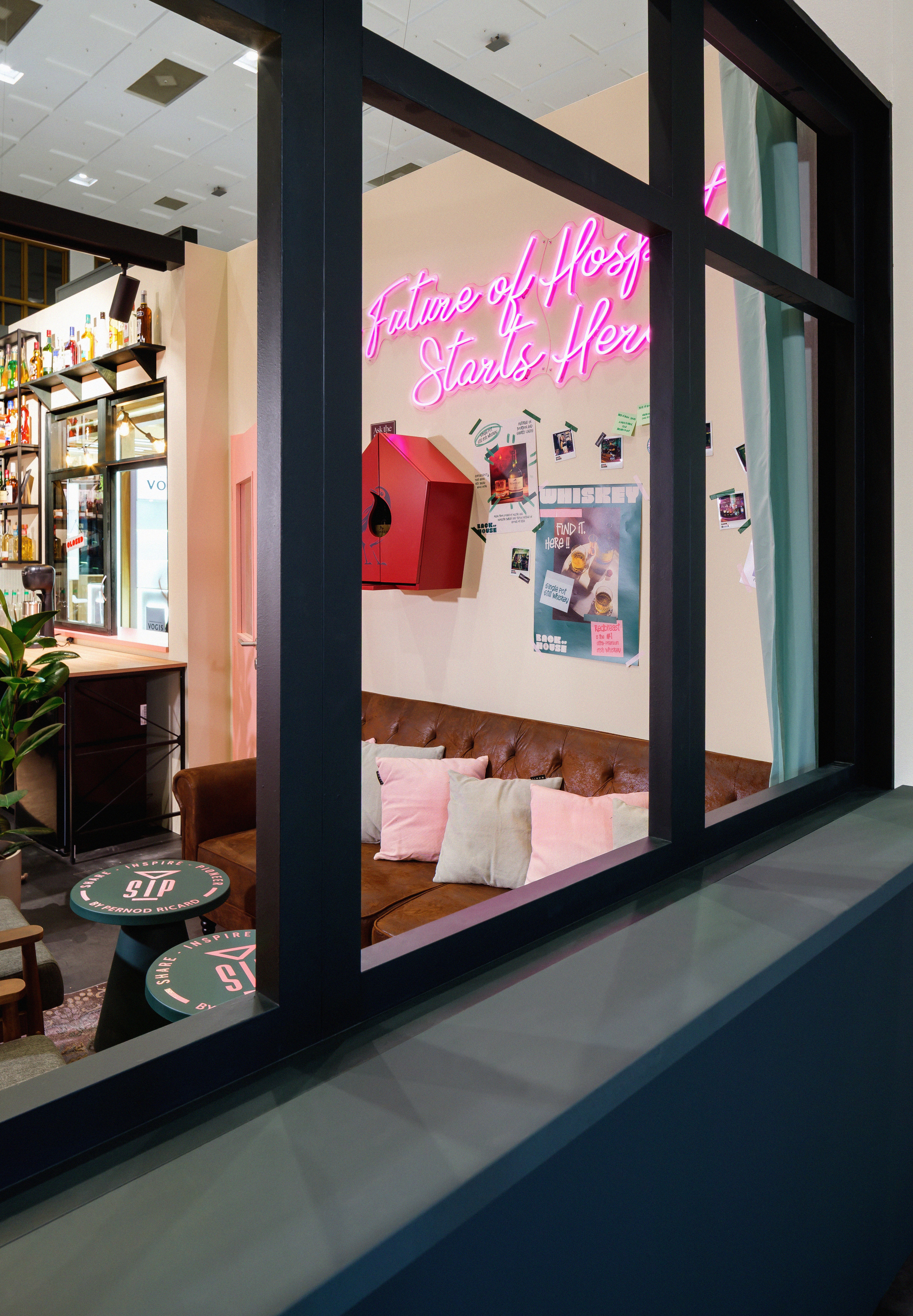 The partner stands, also developed and designed by us, connect directly to the back-of-house space, extending the concept across the entire footprint. Monkey 47 interprets high-performance kitchen culture through The Monkey, while Havana Club continues its Bodega narrative rooted in everyday life and neighbourhood culture. SIP acts as the connective element between these individual worlds.