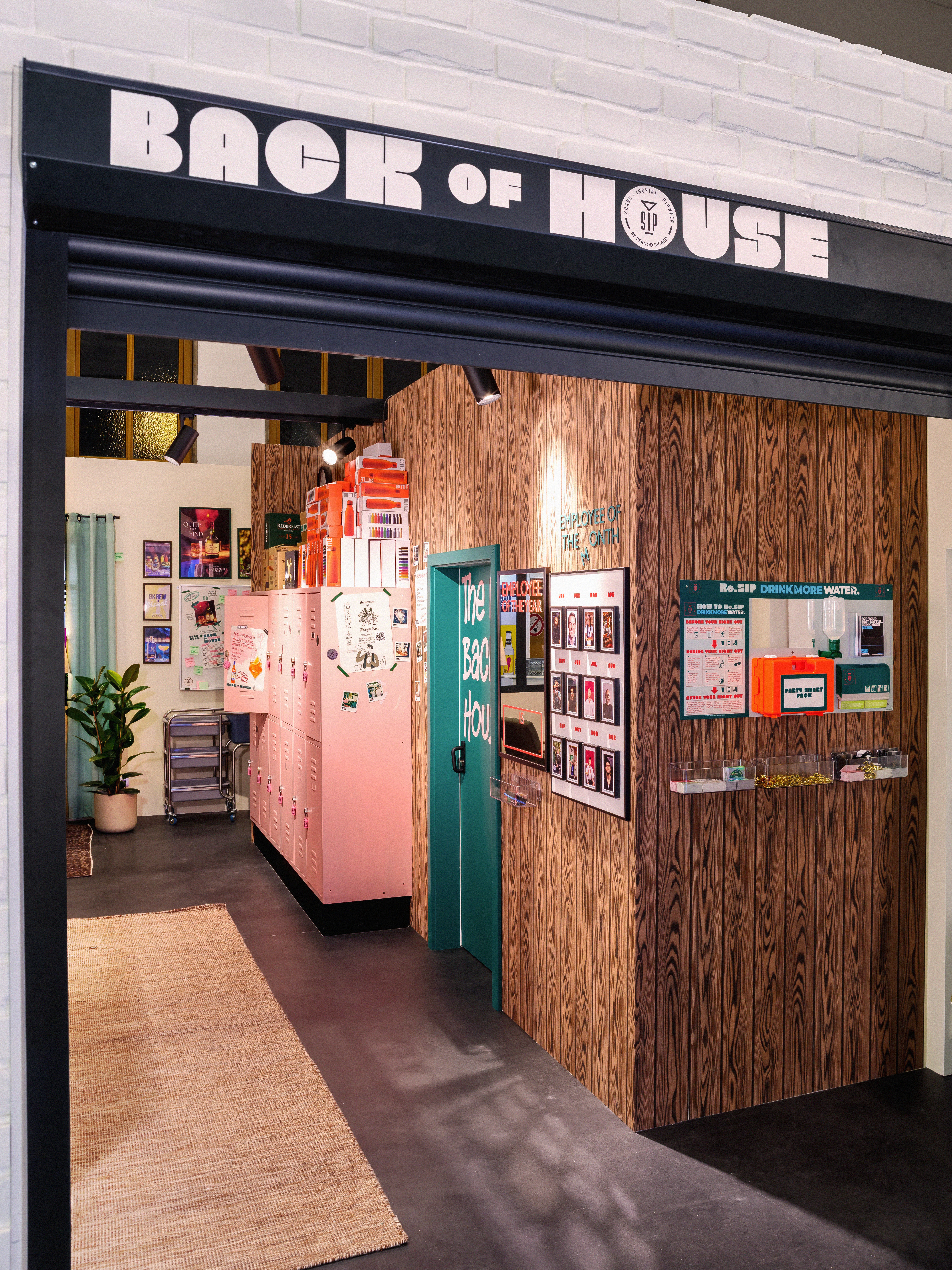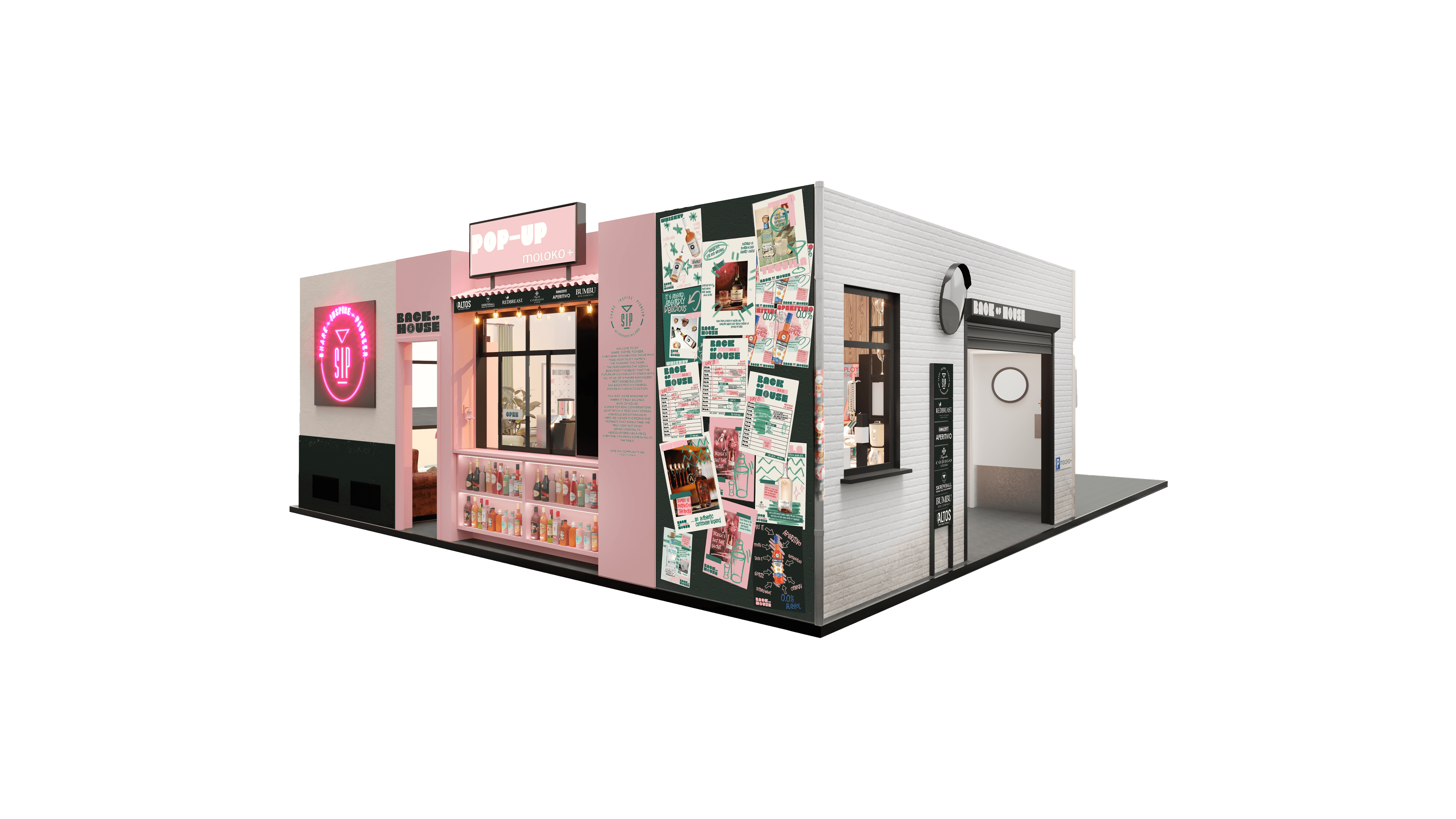 Instead of staging another front-facing brand experience, the concept shifts attention to what usually remains behind the scenes. Inspired by staff rooms, kitchens and back-of-house spaces, the stand reflects the core values of SIP as a bartender platform — exchange, collaboration and hands-on learning. Instead of stating these values explicitly, the design makes them tangible through spatial situations and shared experiences. SIP appears not as a loud brand presence, but as a host that enables encounters, allowing its attitude and purpose to be understood intuitively rather than communicated through overt messaging.