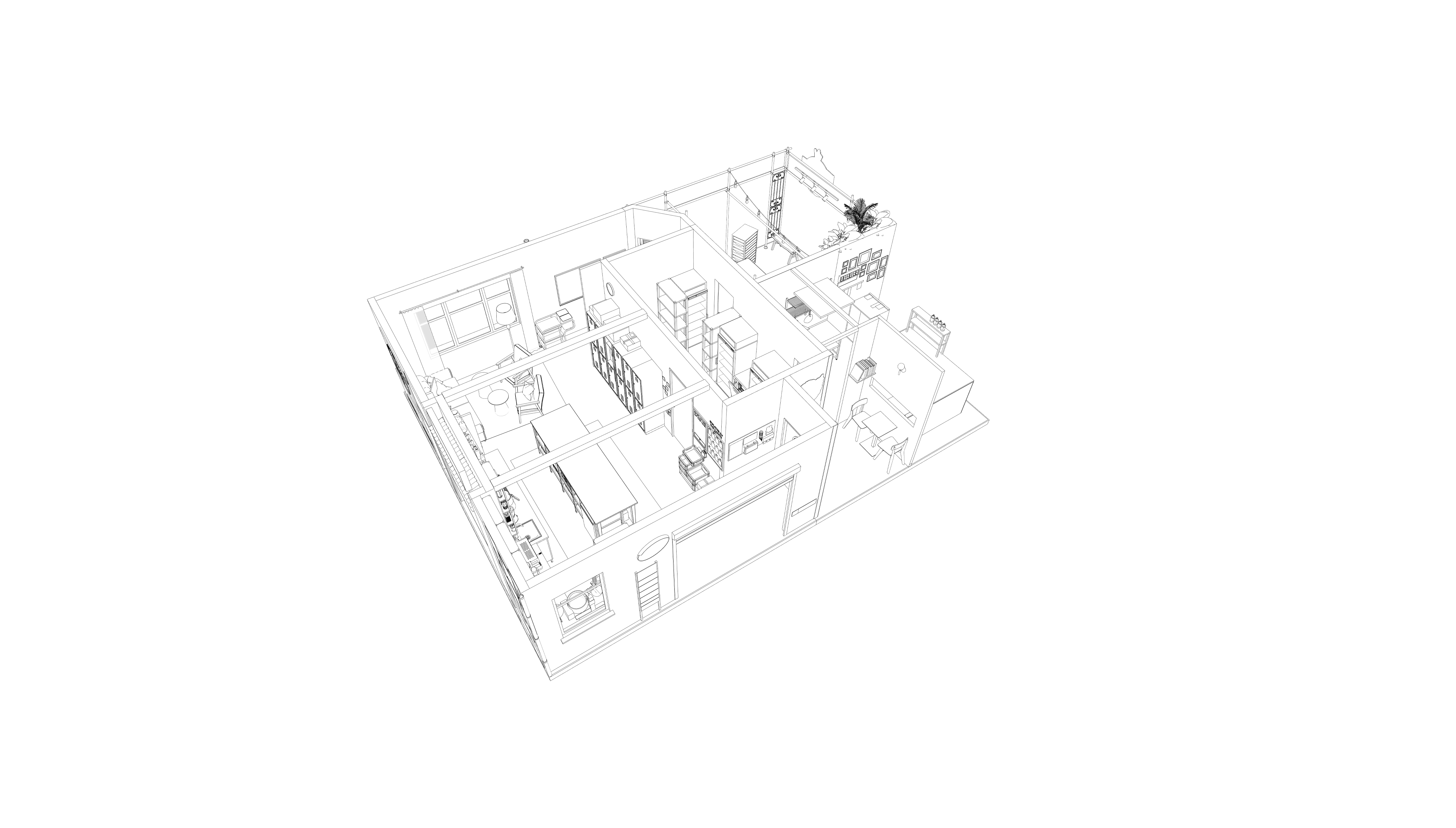 At the centre of the space, a kitchen and communal table form an open bar environment.